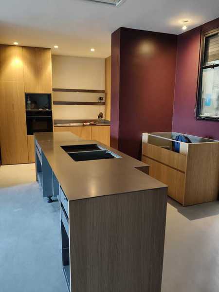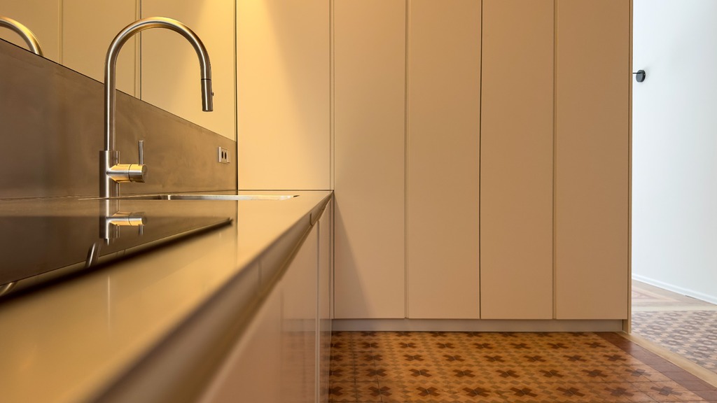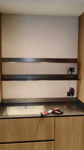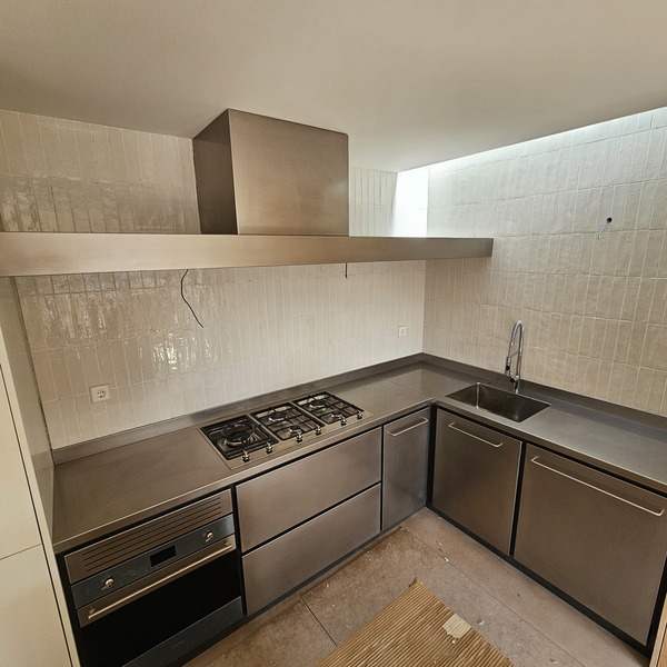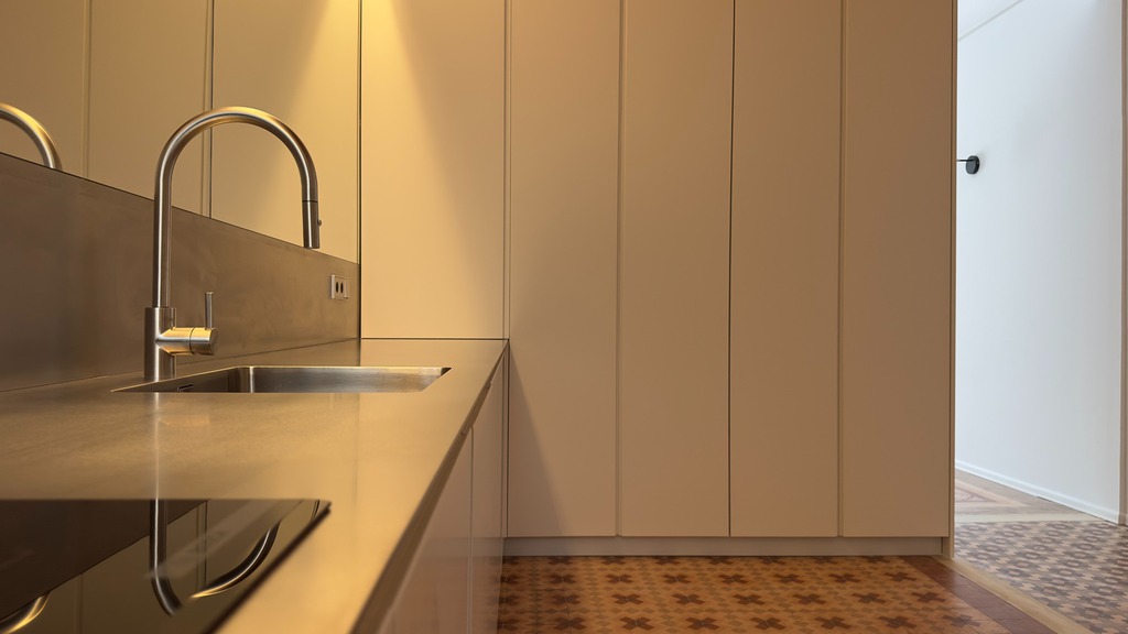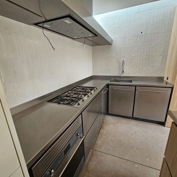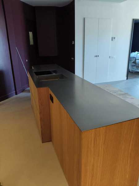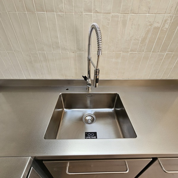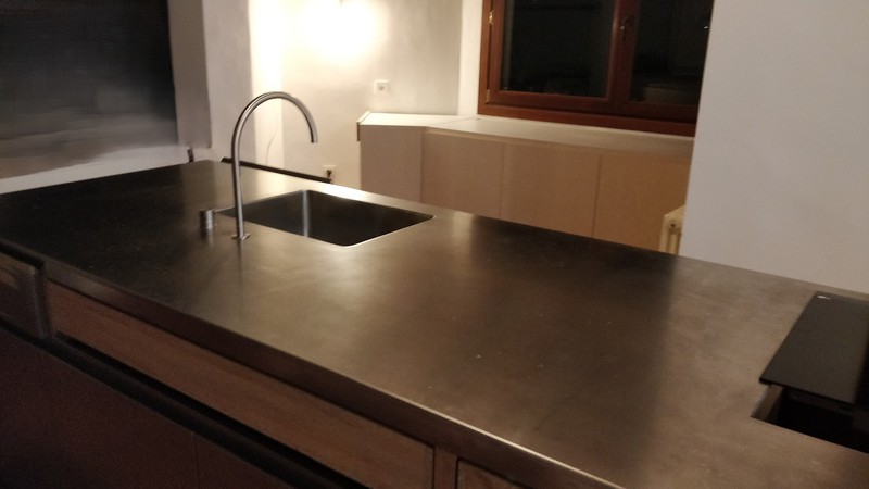 Minimalista encimera exclusiva, de acero inoxidable de 1 cm de grosor.