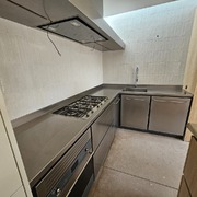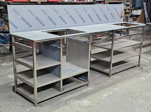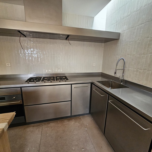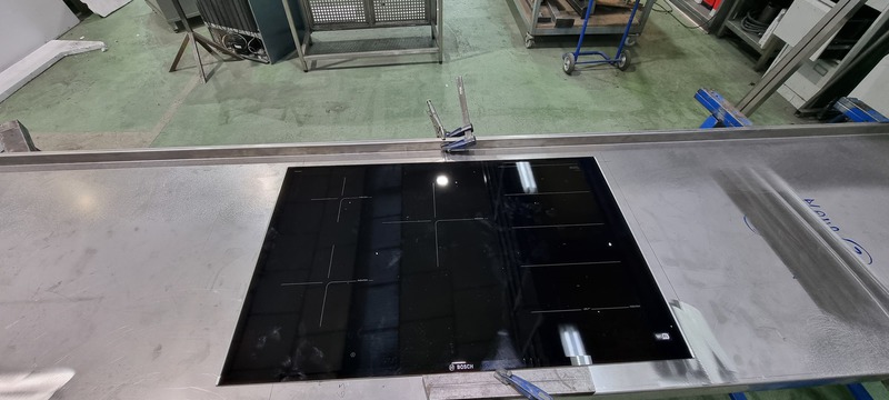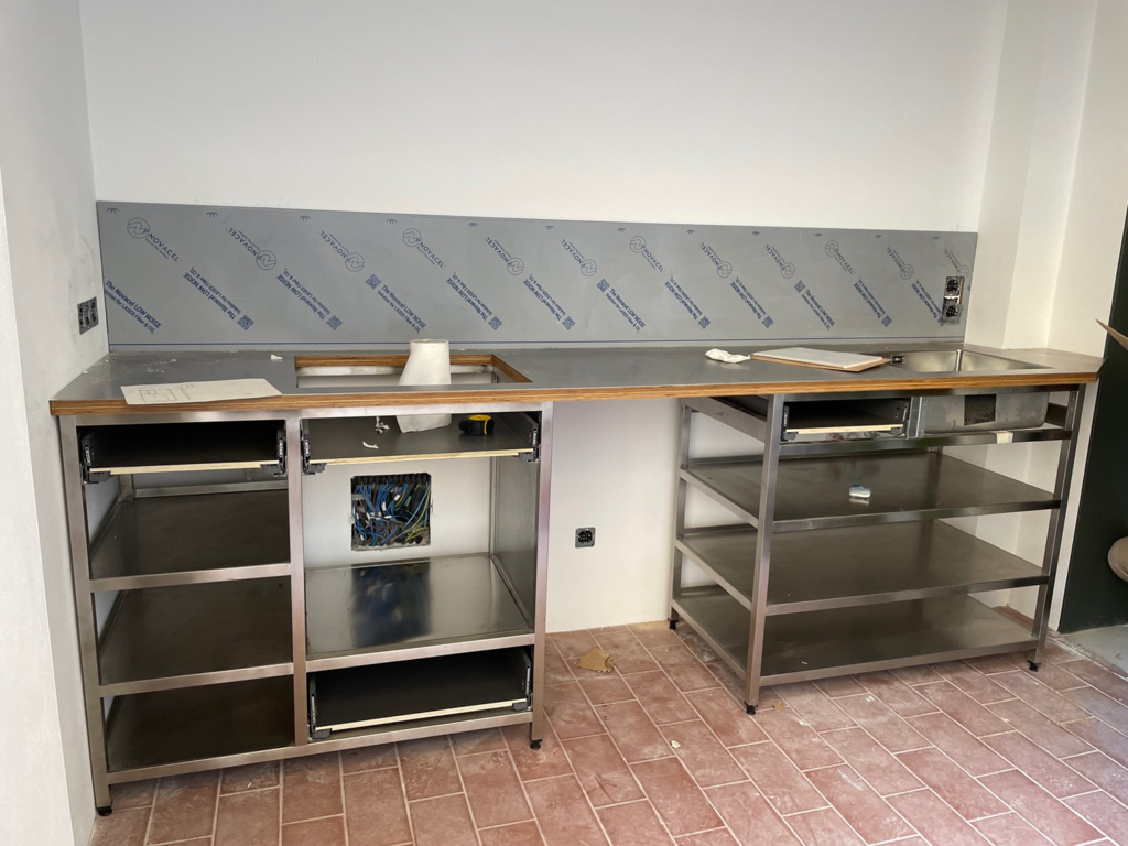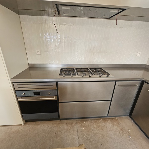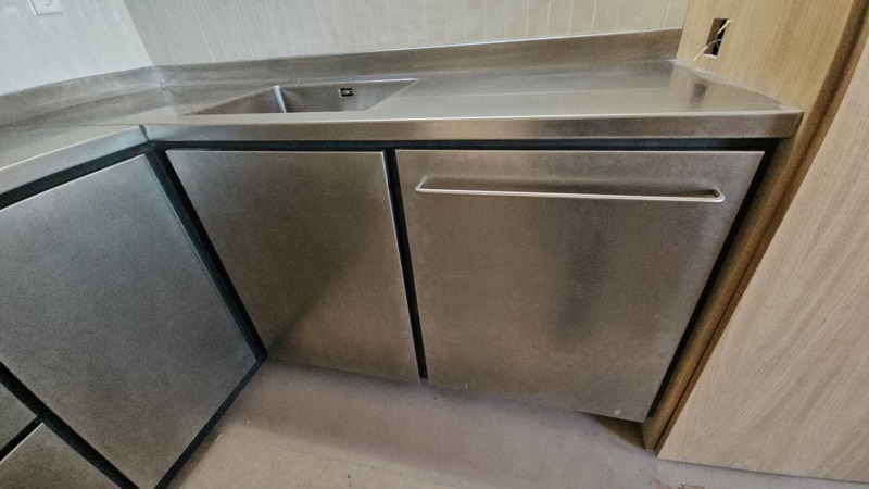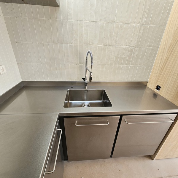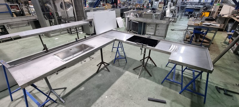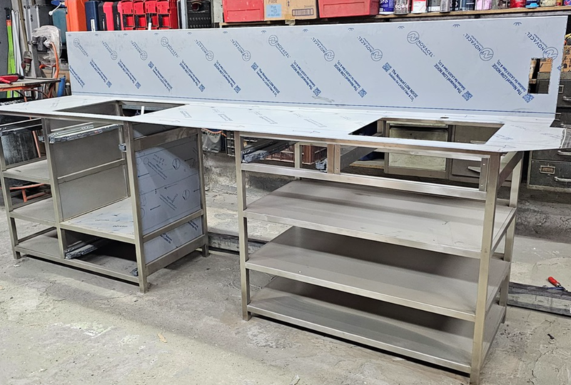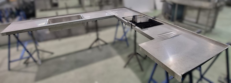 Cocina cerca del mar, de acero inox. 1.5 mm. de gr. fabricada en AISI 316. con un canto delantero de 50 mm. y un peto trasero de doble pliegue y 30 mm. de altura