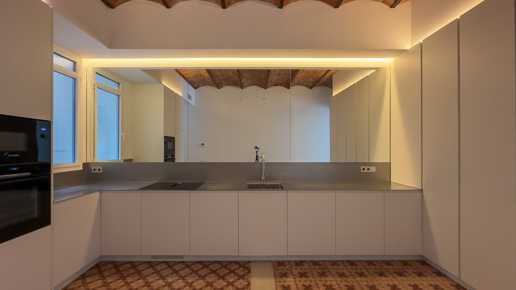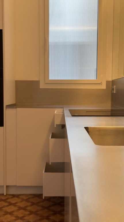 Isla de diseño curvo de acero inox, combinado con un mueble lacado en blanco como el resto de la cocina. que le confiere un toque marinero fabuloso para la ciudad de Badalona donde está ubicada, justo frente al mar en el corazón de las ramblas.
