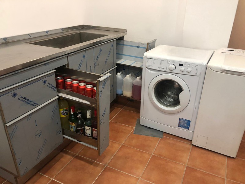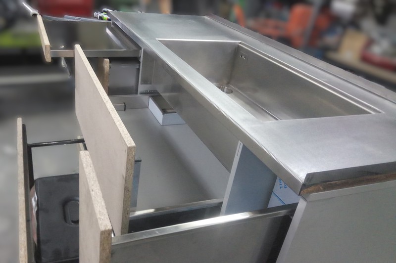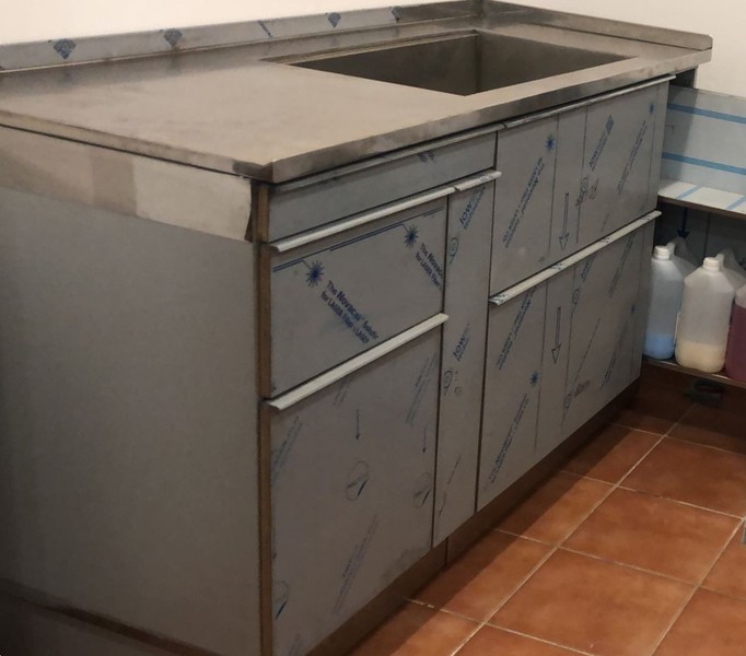 Mueble modular con encimera, frentes y puertas de acero inoxidable. También está provisto de un fregadero de grades dimensiones fabricado a medida.